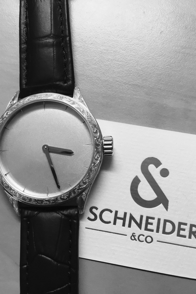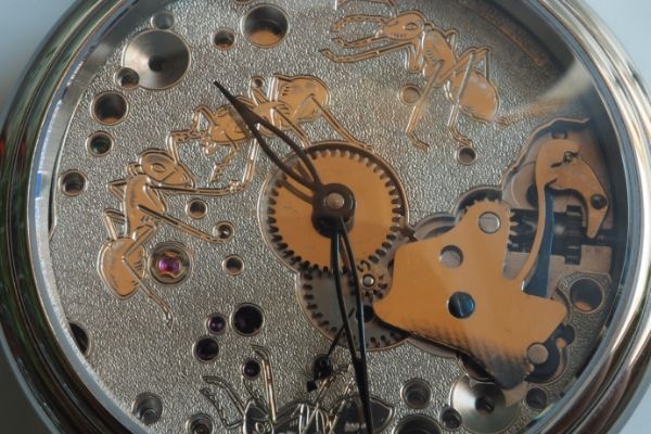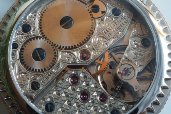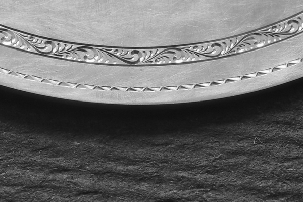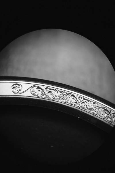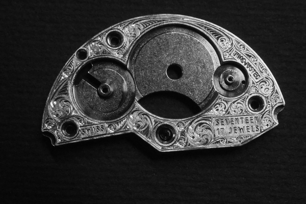 Gravure de volutes dans la technique de la taille douce sur pont de barillet. Cette pièce a été réalisée pour les Montres Filipe Silva.
