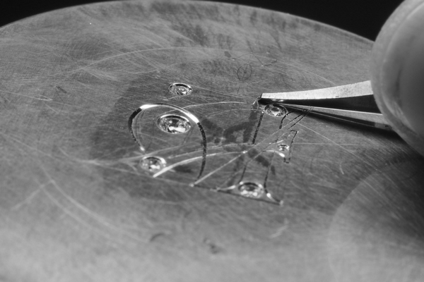 Gravure d’un motif répétitif sur pont de rouage. Cette pièce a été réalisée pour les Montres Filipe Silva. Gravure taille douce et ciselage (structure des étoiles).