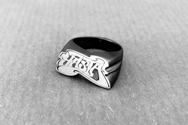 Chevalière gravée sur mesure pour homme en argent 925 noircit. Gravure réalisée pour Mademoiselle O, joaillière et créatrice de bijoux sur-mesure.