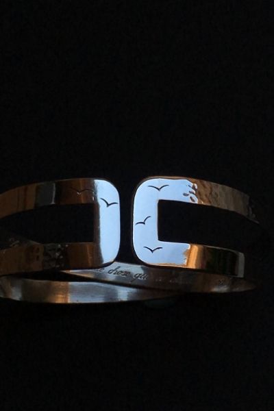 Bracelet sur-mesure de Mademoiselle O. 48 lettres sont gravées à l’intérieur en plus des petits oiseaux de l’extérieur.