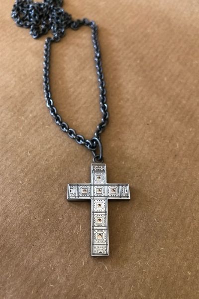 Croix en argent gravée et ajourée façon “moucharabieh”, les sous laissants apparaitre l’or rose en dessous. Bijou sur-mesure de Mademoiselle O.